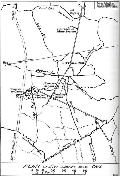 Zivy Cave which could hold an entire battalion of 1000+ men was where WLH was sent on 9 April to wait. It was accessed adjacent to the civilian cemetery at Neuville St Vaast at the southern edge of the battle area. The Zivy Subway led to the battlefield and the route to Thelus, the 28th Bn final objective.