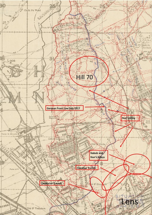 14 Aug 28th Bn WD Order No 16. (See map below) ‘...the Canadian Corps has been ordered to capture Hill 70 LENS’ in order to draw German attention away from the British planned third battle for Ypres. ‘The attack will be carried out by the 2nd Canadian Division on the right…’ ‘ The 28th Battalion will be in old British Front Line System,..should the operation .. prove successful it is intended to further exploit the success by advancing to the line NUNS ALLEY—CINNEBAR Trench to junction with COMBAT thence to Railway Junction N.13.d.70.95 and thence along COTTON Trench to the LENS-