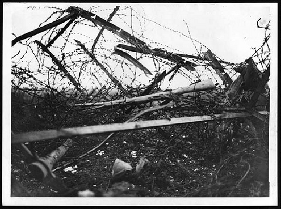 Barbed Wire was used in front of trenches by both sides . Installation and repair of the wire was done at night by wiring parties and involved the use of stakes, metal or wooden. Many lines of wire were often installed to prevent the enemy from getting close enough to lob bombs or grenades. The barbs became more and more vicious as the war went on. In some situations it was used to channel attacks into range of machine guns. The only way to effectively destroy it was by heavy bombardment or over running by the few tanks the allies could deploy. Many pieces of this Iron Harvest are still being found on agricultural land to this day.