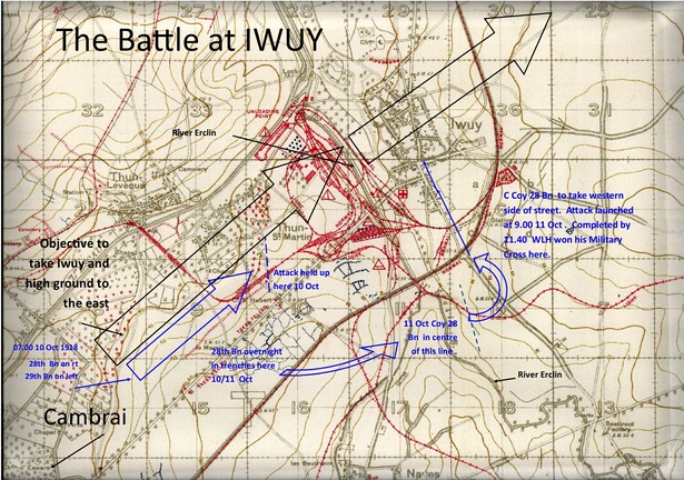 10.10.18 orders for Bn to ‘cross the River Erclin and occupy the village of IWUY and the high ground to the East of same. ' The attack by the 28th Bn was successful and for some time only little resistance was encountered. Attack held up at 10.30 on a line SW of IWUY which was strongly held.