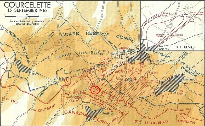 From the War Diaries: (6th IB) 15 Sept. 6th Infantry Brigade carried out attack at COURCELETTE, 27th and 28th Bns assaulting. (WD28th Bn) 28th moved from BRICKFIELDS to point near CHALK PIT, bombs, sandbags, extra ammunitions, flares, picks, shovels drawn for men to carry. Hot meal taken up to men, interrupted by shell fire.